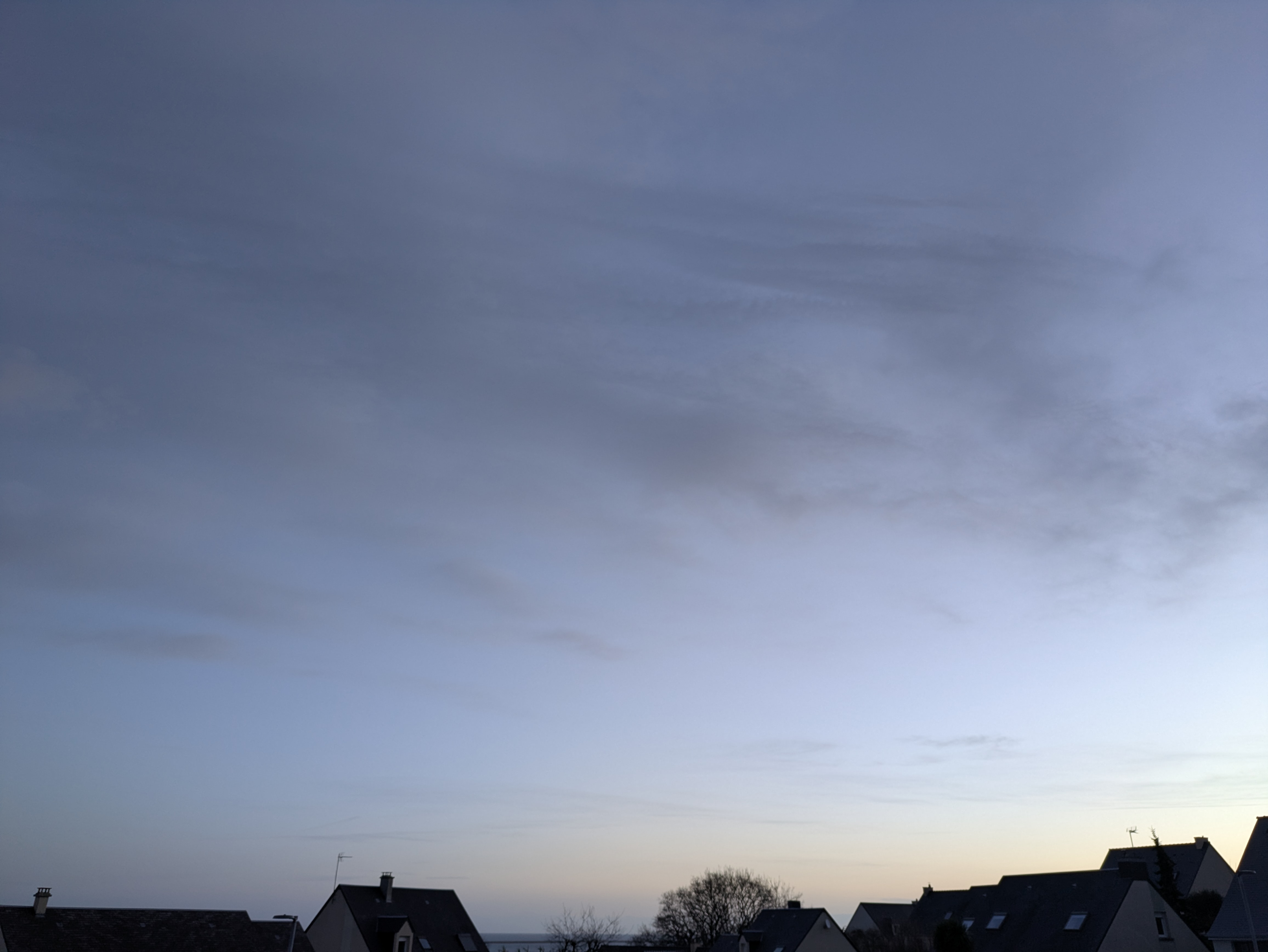 Ciel couvert mais plus clair vers l'Ouest. T° : 0.8°C. T° mini :-0.9°C à 7h45. Pression : 1001 hPa (=). Vent nul. |